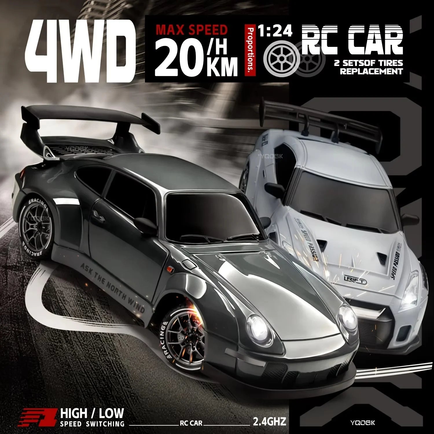 Product features: forward, backward, left turn, right turn, four-wheel drive, replaceable tire, drift, 2-speed, front and rear plastic casing with lights (controllable).